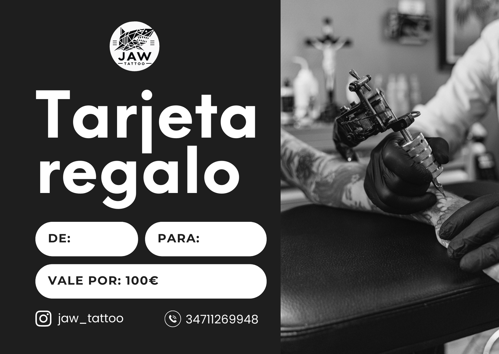 Tarjeta regalo de 100 € para canjear en JawTattoo. Ideal para que esa persona se anime por fin a tatuarse lo que lleva tiempo queriendo.